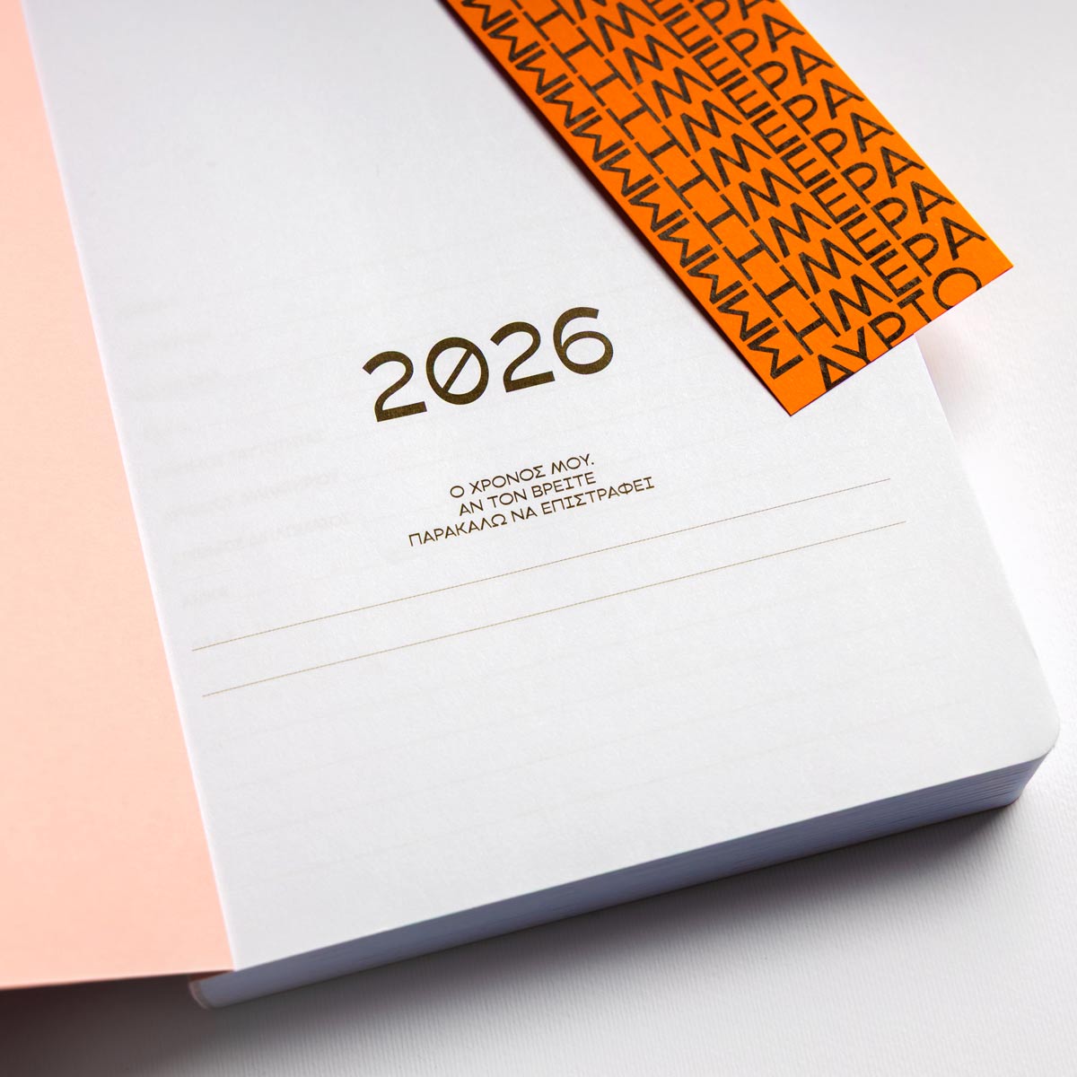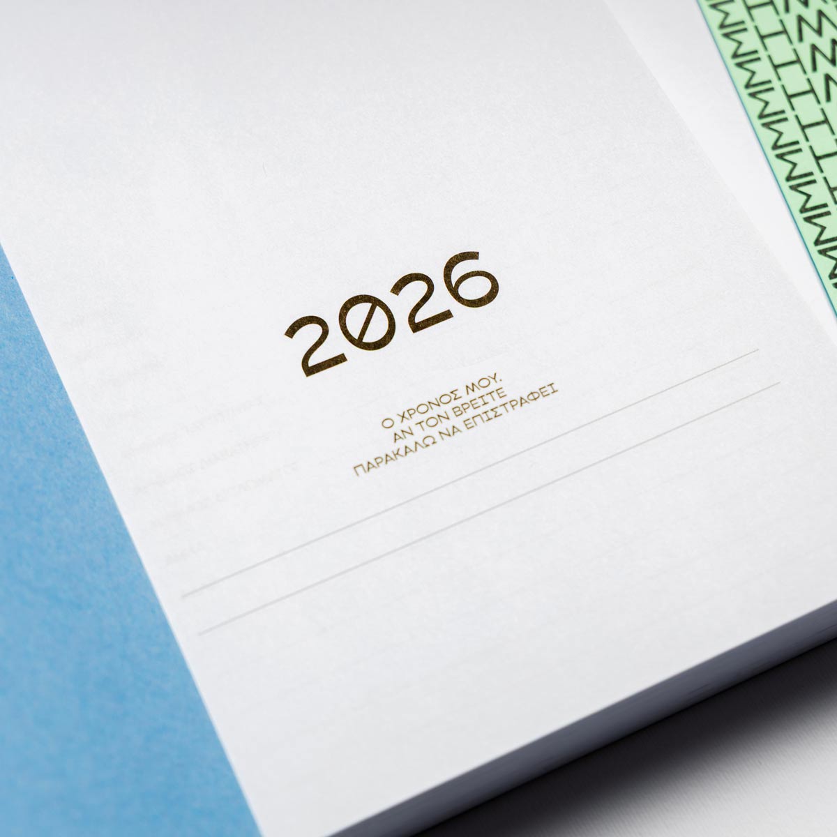 The FtoP 2026 Daily Planner – “My Time” is not simply a tool for organization, but a personal object that quietly reminds us that our time belongs to us. Inspired by both the passing and the suspension of time, it draws from that liminal moment —when one day dissolves into the next and time seems to pause, if only for a breath. Conceived as a dialogue between “now” and “then,” the planner’s visual identity, curated by today studio, bridges the old and the contemporary through bold, restrained typography and a carefully selected palette of Colorplan papers by Perrakis. The result is a calm, tactile object designed for everyday use, for those who seek to hold time in their hands and, even briefly, make it stand still.